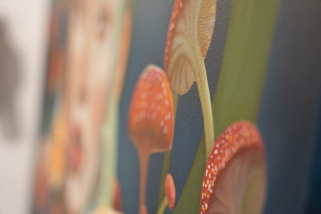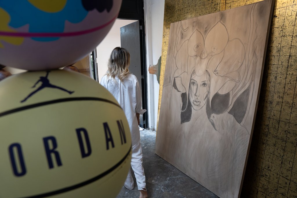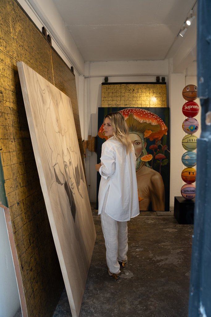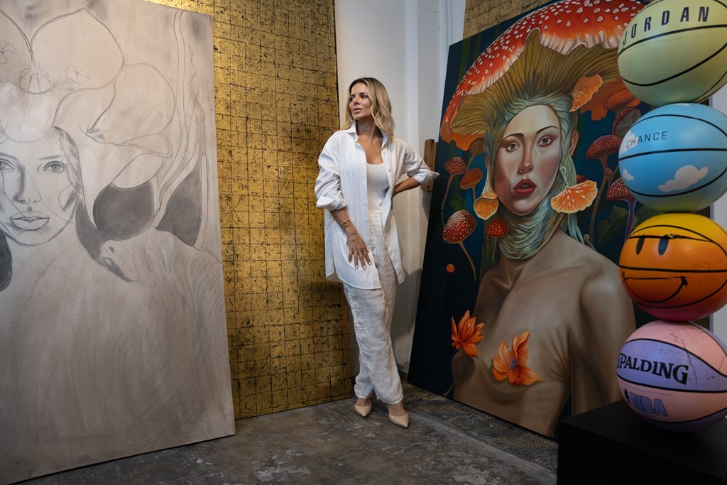 Su voz se llena de emociones cuando habla de sus obras y de la historias que las personifican,ofreciéndoles un espacio en este mundo terrenal… Y el olor a resina y madera empieza a embelesar recordando el espacio tan personal en el que solo unos cuantos han tenido el privilegio de estar como invitados. Ensimismada prosigue: «Creo que esta nueva serie que comencé de las “Diosas”, basada en medicina ancestral, definitivamente está generando un impacto a nivel técnico de pintura, ya que estoy pintando largas jornadas, pero también encuentro un punto de reflexión a través de cómo en la historia de la humanidad el ser humano ha trascendido y alcanzado diversas formas de evolución según su época, pero sobre todo el poder experimentar la conexión de estas plantas con la naturaleza, con esa parte sensible, humana y real que todos tenemos por dentro y que por alguna razón la vamos perdiendo o simplemente el sistema en el vivimos nos lleva por un camino completamente alejado de nosotros mismos en ese sentido».