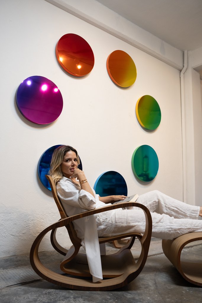 Karen Rumbos nos abre las puertas de su templo artístico: Su estudio; un lugar mágico impregnado de ella, de su arte, de su manera de ver al mundo y de libre expresión… En medio de una decoración rústica, con muebles de madera encontramos un elegante y sofisticado Bubble, de Roche Bobois, azul eléctrico que cambia totalmente la perspectiva de este lugar y lo vuelve aún más asombroso, creando un espacio lleno de inspiración en una de las colonias que se ha vuelto el objetivo de algunos artistas para establecer sus estudios: Santa Maria la Ribera